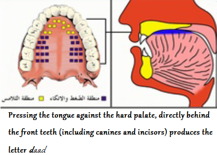 More often, the left molars only are involved in producing the daad as this is easier. Knowing the point of articulation and mastering it is important. Commonly, this letter is transliterated into dh which I find may be confusing, especially in words where the letter haa or haa follow. Example: the word ( أضحى ), as I’d spell Adhaa or even Ad-haa would then need to be written as Adhhaa but is often written as Adha. Complications can occur, but only stringent Arabic teachers (and alike) should take note of these and avoid them when teaching.
