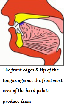 The “gum” being referred to here is that which is behind the front molars, incisors and canines, i.e. the hard palate. Usually the righter side of the edge produces laam. Nevertheless, it is important to ensure the edges are producing the laam, and not just the tip of the tongue.